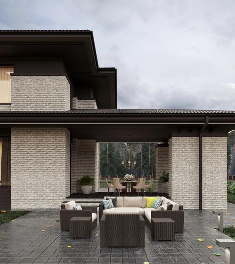 Обшивка свесов кровли (включая потолок балконов, террас, крылец) виниловыми софитами или имитацией бруса с тонированием (по проекту)