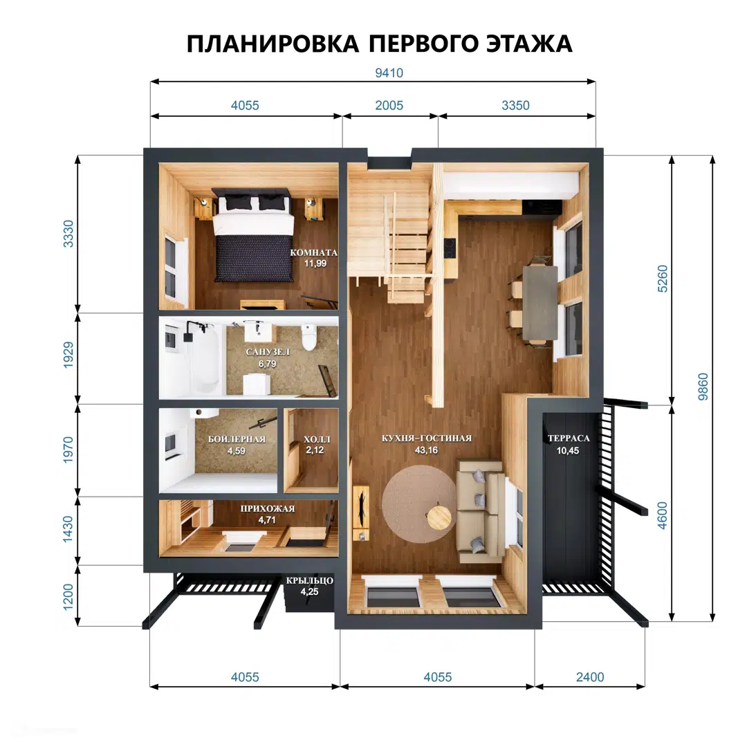 На первом уровне располагается обособленная спальная комната, практичный санузел, техническое помещение, просторная комната для хранения вещей и гостеприимная прихожая. Центральным элементом дома, безусловно, является обширное кухонное пространство, объединенное с гостиной, куда льется солнечный свет через большие окна. Из гостиной предусмотрен прямой доступ на террасу, защищенную двускатной кровлей – идеальное место для отдыха на открытом воздухе вне зависимости от погоды.