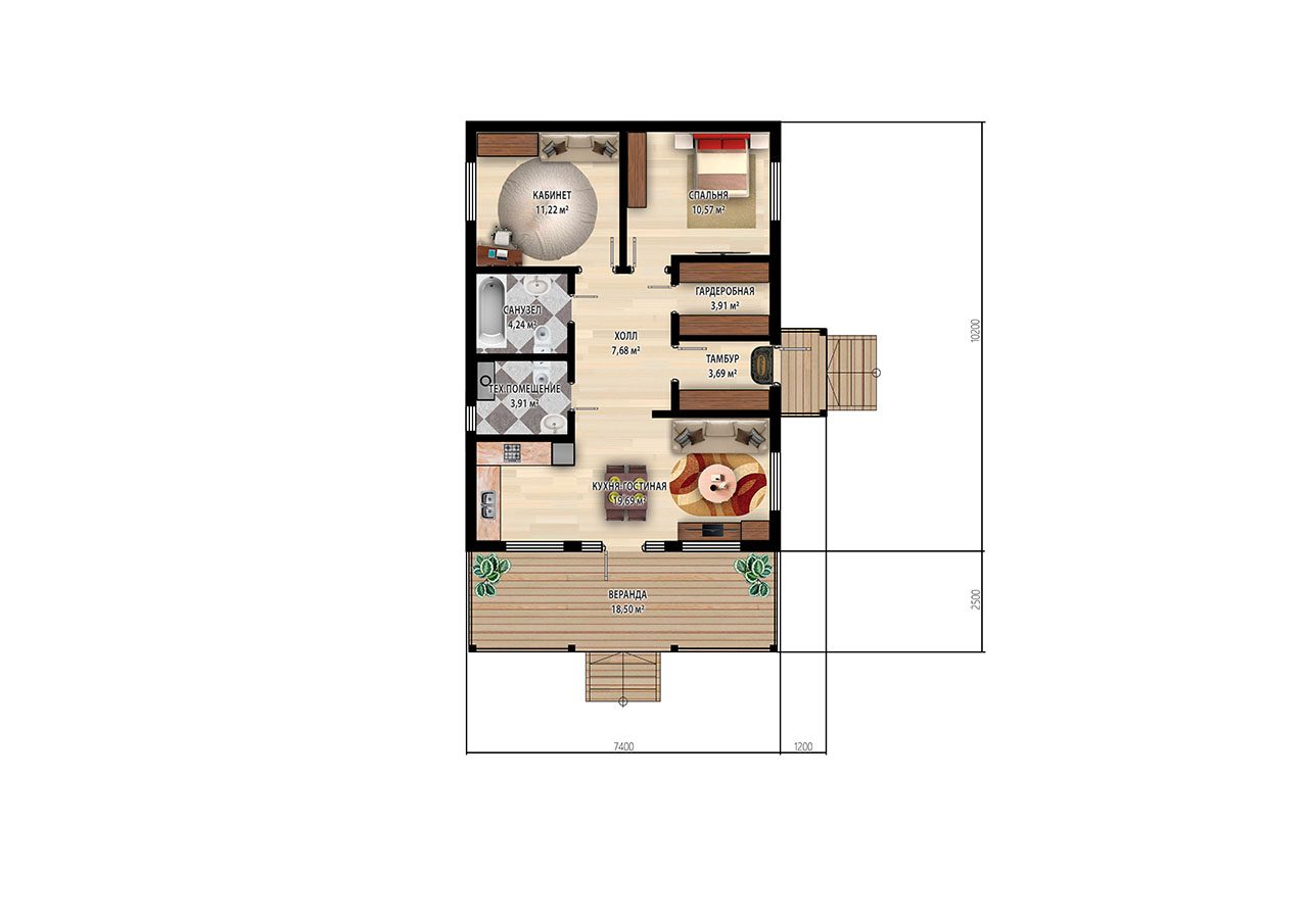 Этот дом, размером 7,8*9,5 метров и общей площадью 74,1 кв.м, – это оптимальное решение для тех, кто ценит рациональное использование пространства и стремится к гармонии с окружающей средой. Удобная и продуманная планировка включает в себя все необходимое для комфортной жизни: