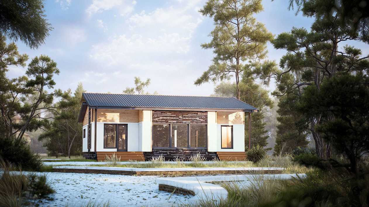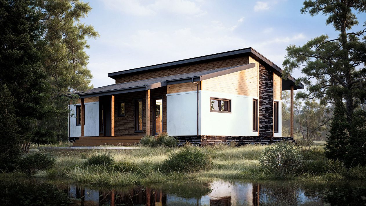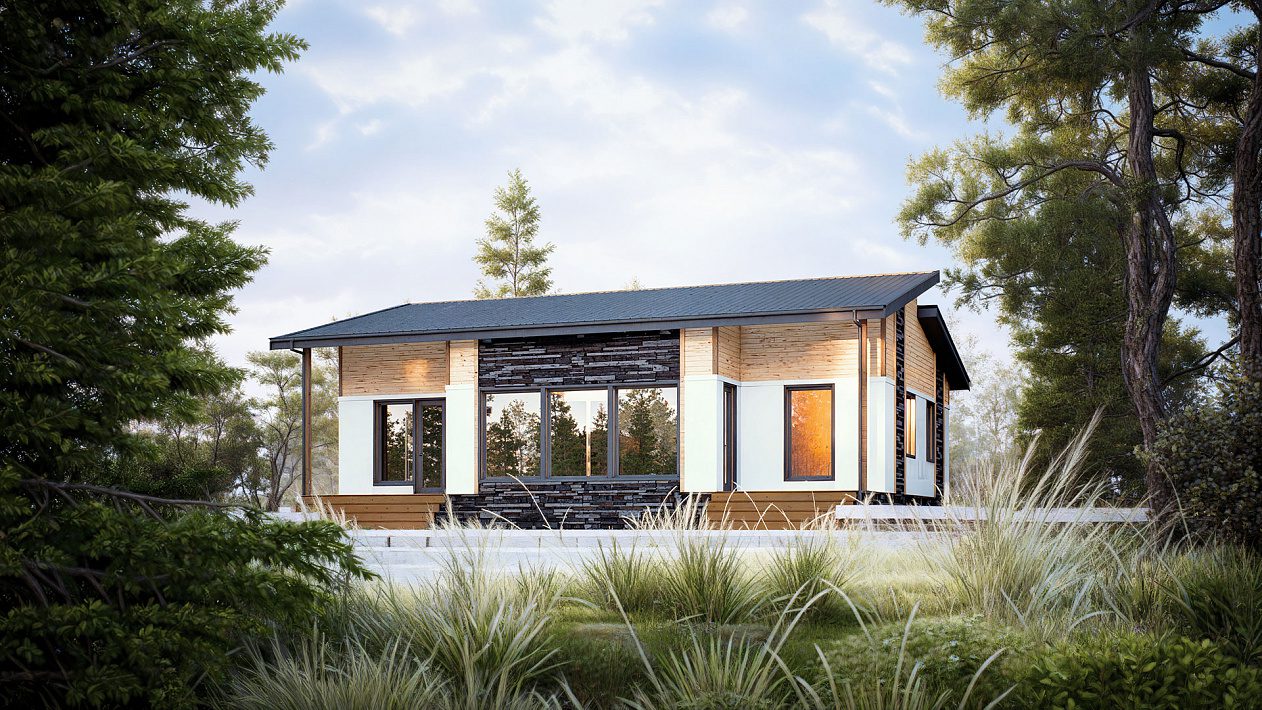 Облицовка имитацией бруса придает дому вид натурального деревянного строения, гармонично вписывающегося в окружающий ландшафт. Двухскатная кровля не только эстетична, но и практична, обеспечивая надежную защиту от непогоды. Панорамное остекление наполняет дом естественным светом и открывает прекрасный вид на окружающую природу. Камин в гостиной создает атмосферу тепла и уюта, а возможность переоборудования комнаты в сауну добавляет элемент релаксации и оздоровления. Лестница на крышу позволяет использовать пространство над домом для отдыха или хозяйственных нужд.