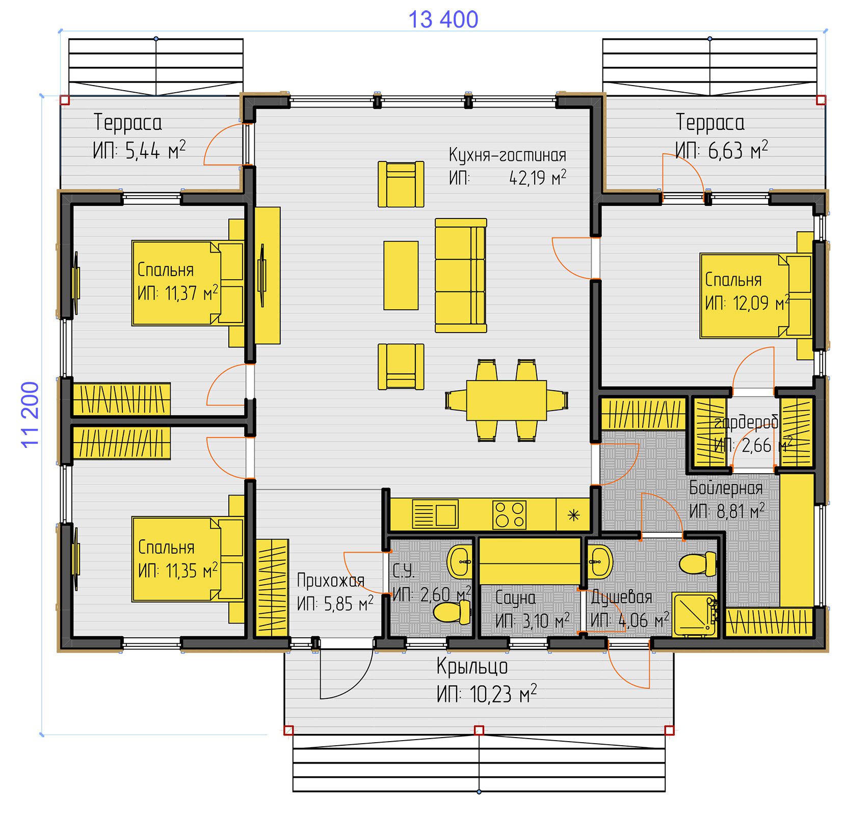 Дом одноэтажный каркасный по финской технологии. Размеры 11,5*13 метров, площадь 115,4 кв.м, удобная планировка: 3 спальни, кухня-гостиная 32,3 кв.м, 2 санузла с душевой, крытая терраса 11,1 кв.м, крытое крыльцо 3 кв.м, 2 входа в дом, облицовка дома имитацией бруса, кровля двухскатная, панорамное остекление, камин в гостиной, возможно переделать комнату в сауну, в комплектации предусмотрена лестница на крышу.