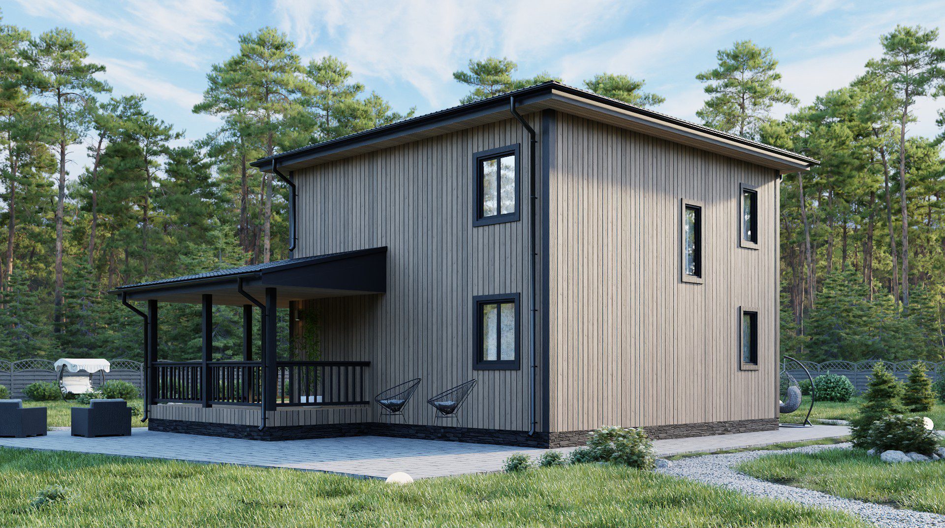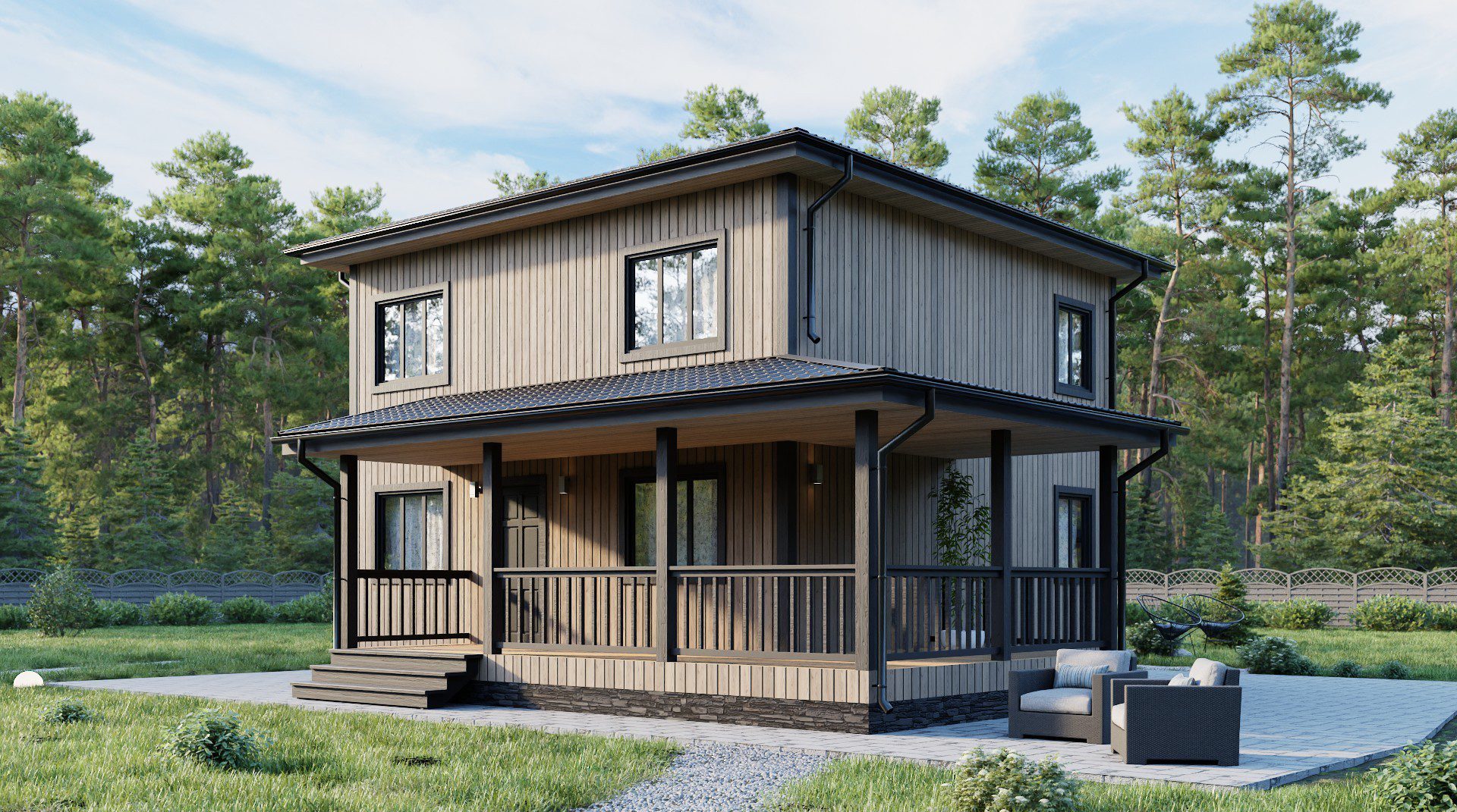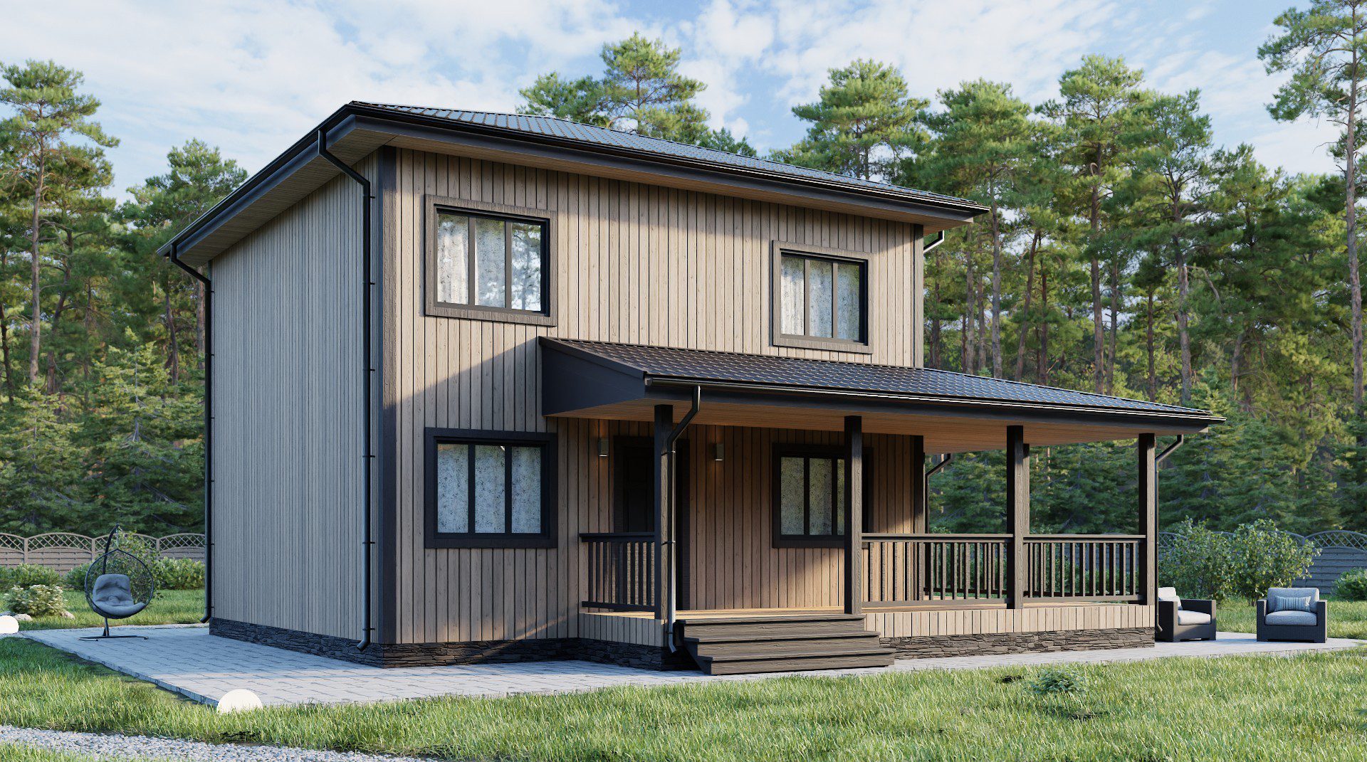 На первом этаже вас ждет уединенная спальня, функциональный санузел, котельная, вместительная гардеробная и приветливая прихожая. Сердцем дома, несомненно, является просторная кухня-гостиная, залитая солнечным светом, проникающим сквозь панорамные окна. Из гостиной открывается прямой выход на террасу, укрытую под двускатной крышей – идеальное место для отдыха на свежем воздухе в любую погоду.