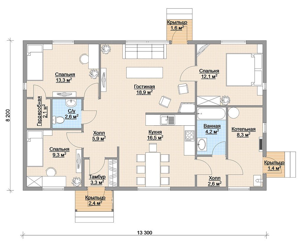 Проект дома разработан с учётом всех потребностей современной семьи. В нём есть всё необходимое для комфортной жизни: просторная кухня-гостиная, три отдельные комнаты, два санузла и котельная. Здесь каждый почувствует себя как дома и сможет насладиться уютом и теплом.