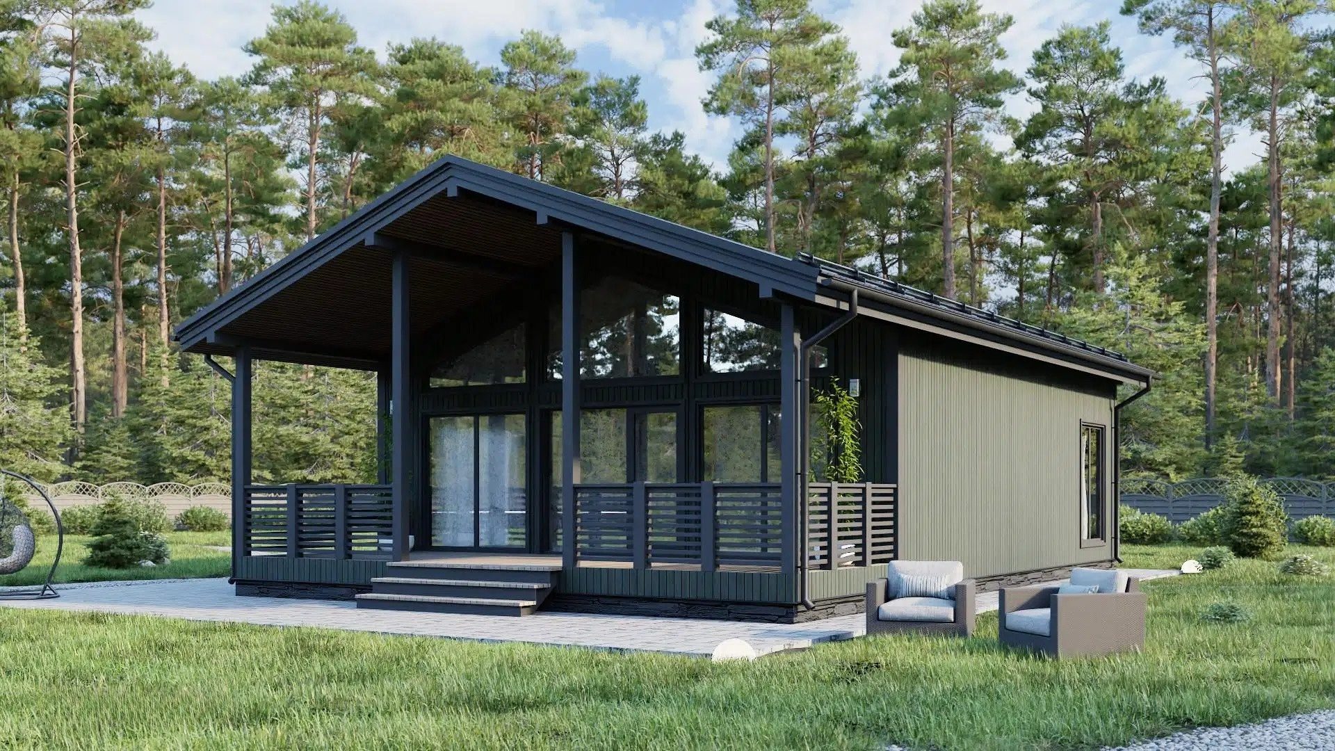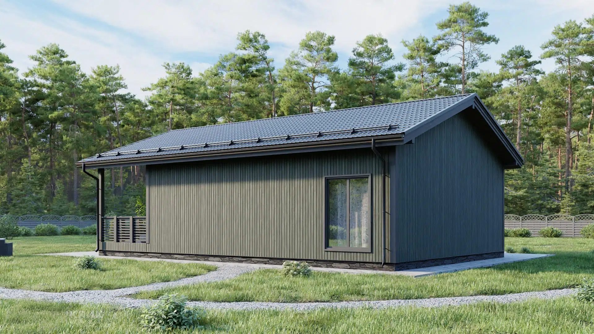 Этот одноэтажный проект – яркое выражение современной изысканности, воплощенное в каркасной конструкции. Обширные выступы кровли, напоминающие крылья грациозной птицы, нависают над зданием, создавая пленительную игру света и тени на гладких поверхностях панорамных окон. Открытые стропила, простые и четкие, будто линии на эскизе, акцентируют лаконичность архитектурного решения. Большая терраса, как теплые руки, простирается перед парадным фасадом, обещая спокойные вечера под звездами и веселые семейные трапезы, наполненные смехом и ароматами зелени.