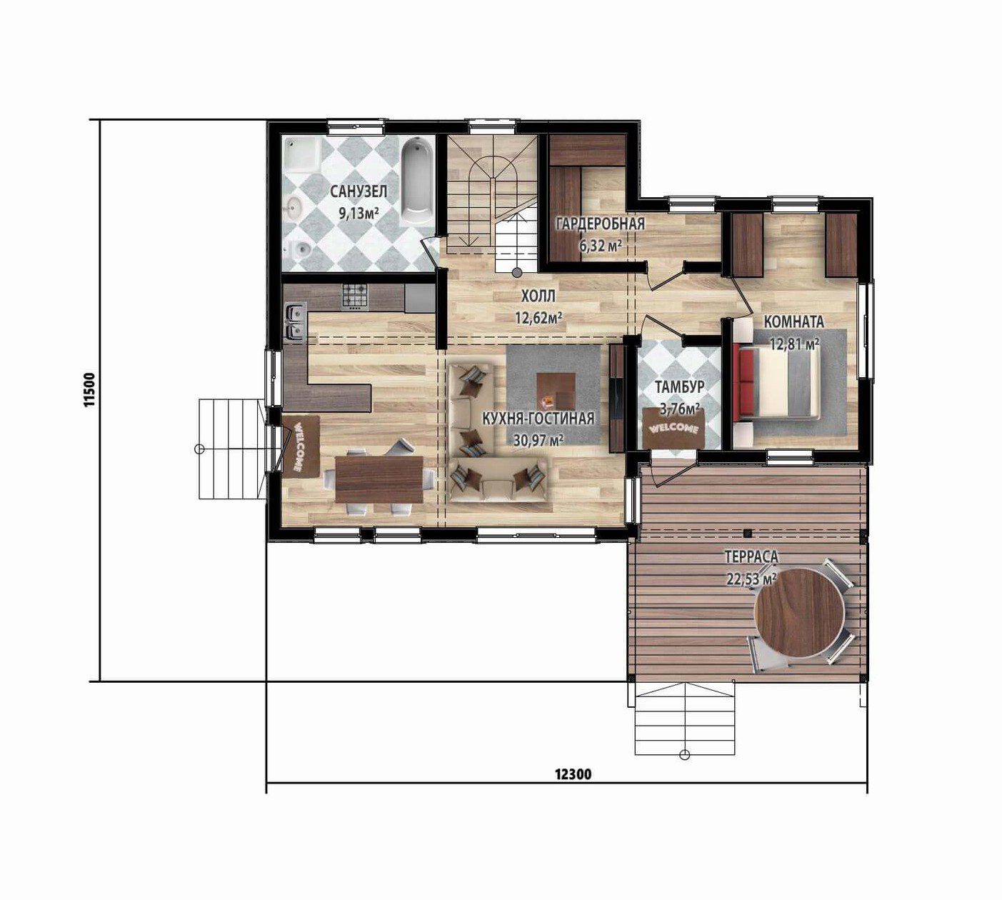Этот коттедж – не просто строение, а живописный холст, сотканный из уюта и надежности, предназначенный для комфортного проживания на протяжении всего года и счастливой семейной жизни. Габариты дома составляют 11,5 на 12,3 метра, элегантно дополненные просторной террасой и приветливым крыльцом, приглашающими насладиться красотой окружающей природы.