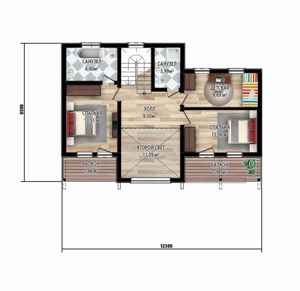 Второй этаж – это зона умиротворения и приватности. Здесь находятся три светлые спальни, два санузла и уютный холл.