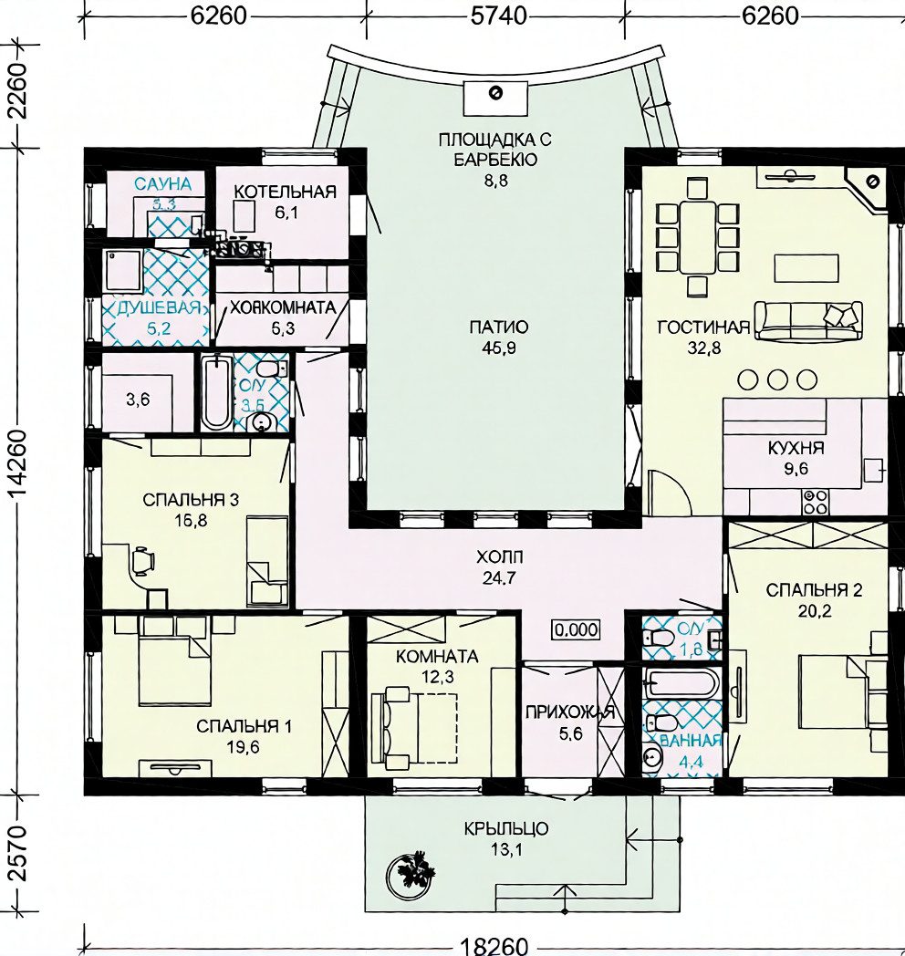 Дом дополнен просторной террасой площадью 69 кв.м., где можно наслаждаться свежим воздухом и проводить время с близкими. Крытое крыльцо с навесом под автомобиль площадью 45 кв.м. обеспечивает защиту от непогоды и удобство парковки.