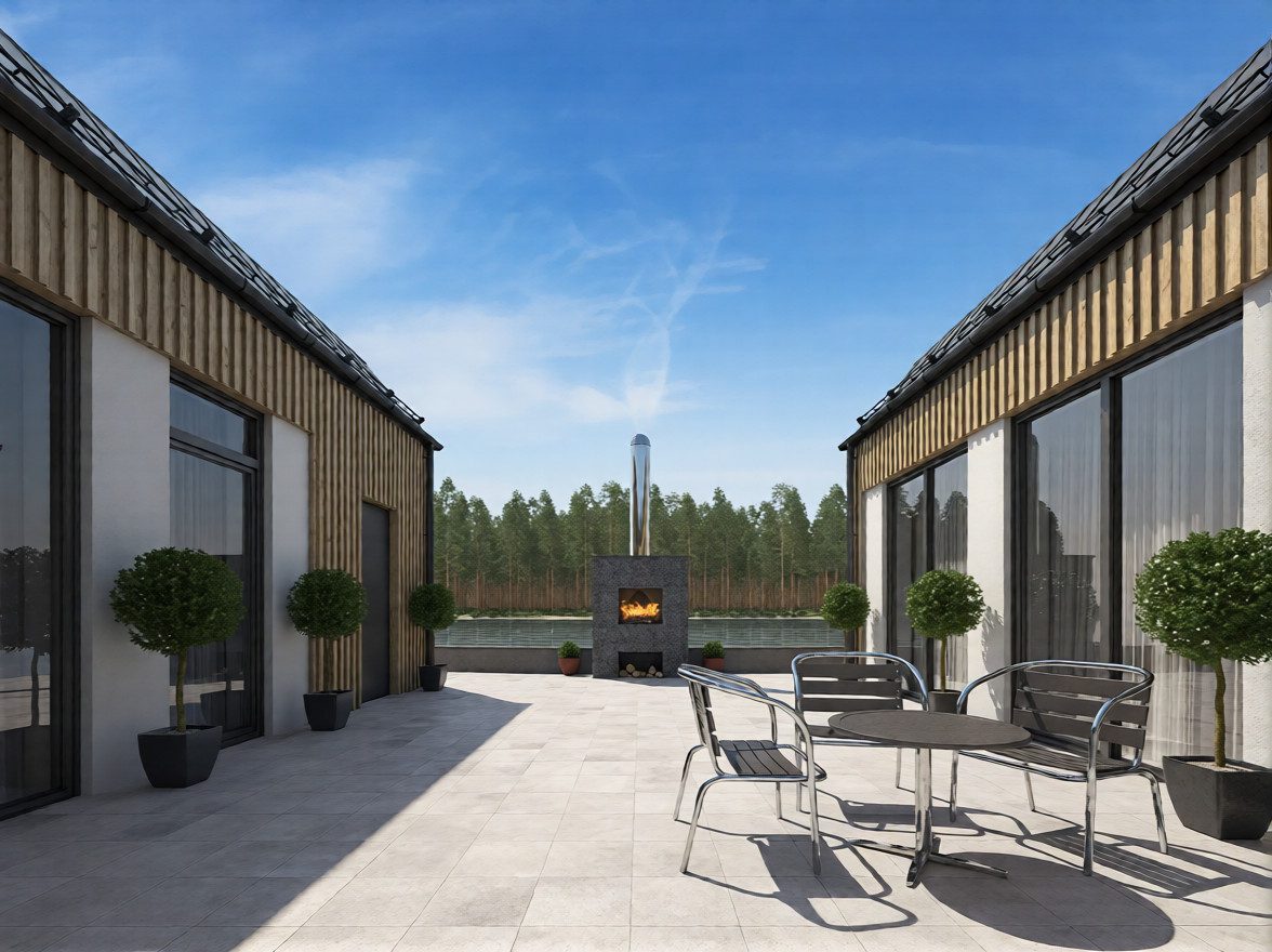 Дом, общей площадью 197,5 кв.м., имеет размеры 15,2 на 22,7 метра. Его лаконичный дизайн подчеркивается односкатной плоской кровлей и панорамным остеклением, которое обеспечивает максимальное естественное освещение и визуально расширяет пространство, стирая границы между внутренним уютом и окружающим ландшафтом.