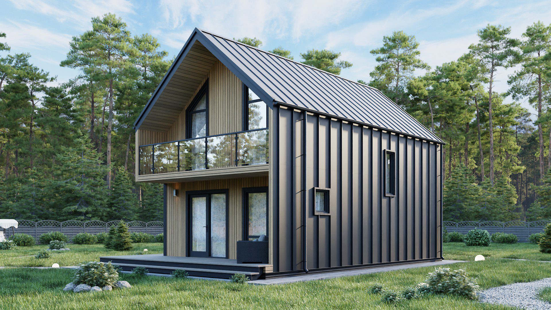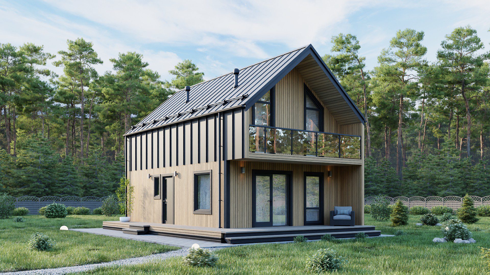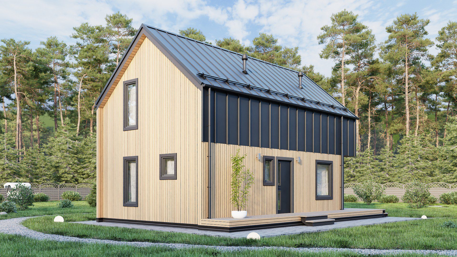 Двухэтажный каркасный дом, выполненный в стиле Барнхаус, представляет собой гармоничное сочетание лаконичного дизайна и современных удобств. Его архитектурный вид, вполне достойный журнальной обложки, приковывает взгляд своей умеренностью в линиях, асимметричными формами, крупными окнами, заливающими светом передний фасад, и уютной верандой под крышей, манящей к отдыху на свежем воздухе. Этот проект, общей площадью 108 м², – это не только визуально привлекательное строение, но и функциональное жилое пространство, разработанное для комфортного проживания семьи, состоящей из 3-5 человек.