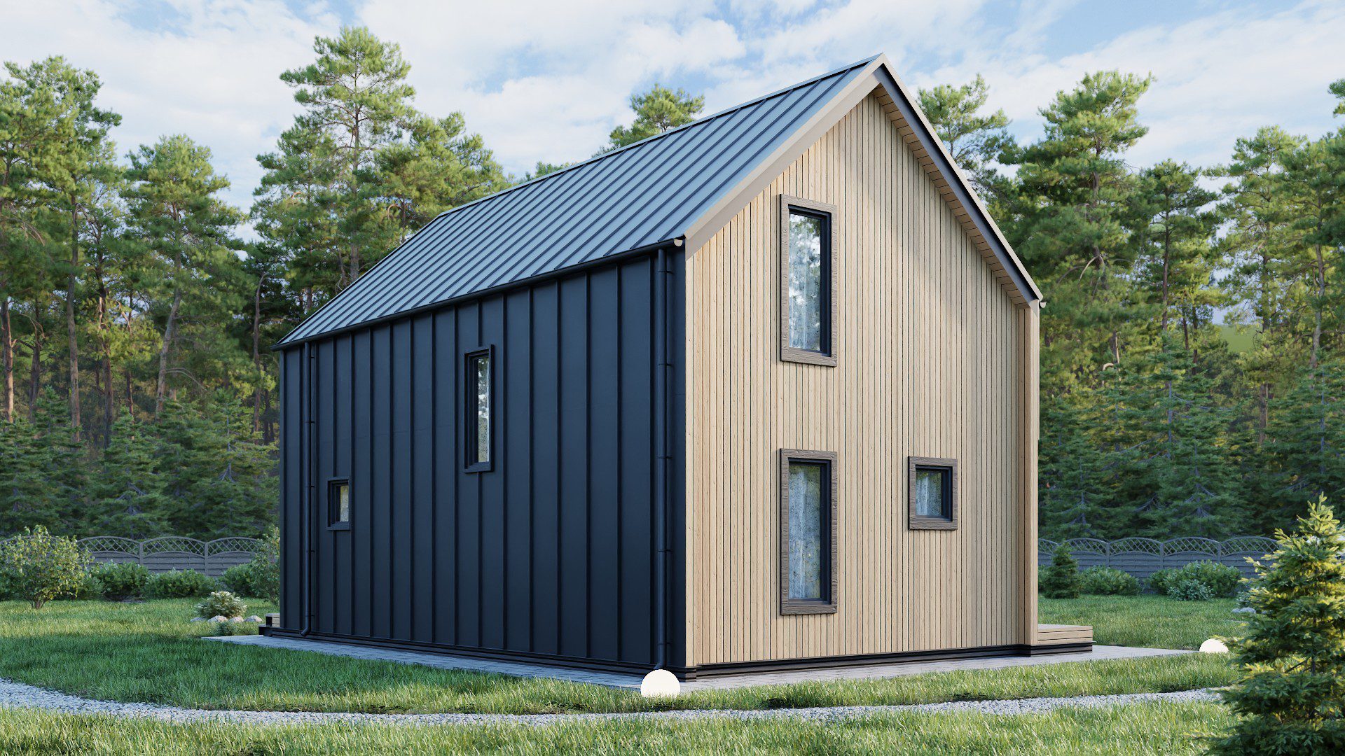 Стандартный вариант: для облицовки фасада имитатор бруса; для кровли – металлочерепица. Вы можете подобрать материал на свой вкус: для фасада – сайдинг, пластиковые фасадные панели, фанера или ЦСП и др.; для кровли – мягкая черепица, фальцевая кровля, профлист и др.
