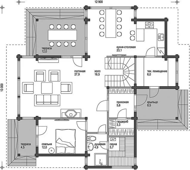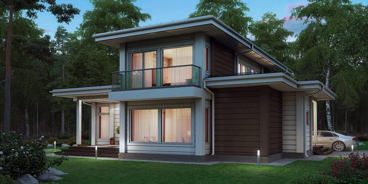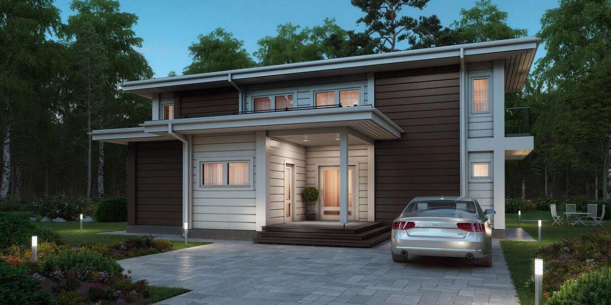 Просторное жилище площадью 170 кв.м – это квинтэссенция комфорта и актуального дизайна. Дополненный верандами и балконами, он словно приглашает насладиться чистым воздухом и захватывающими пейзажами. На первом этаже располагается уютная сауна. Три спальни готовы радушно встретить посетителей или стать личным убежищем для каждого члена семьи. Панорамное остекление размывает границы между внутренним убранством и окружающим миром, наполняя дом светом и ощущением простора. Завершает этот архитектурный образ плоская кровля – выбор, обусловленный не только эстетическими соображениями, но и практичностью: Современный облик: Плоская крыша придает дому минималистичный и ультрасовременный вид, подчеркивая его элегантность и сдержанность. Рациональное использование пространства: Крыша становится дополнительной зоной – террасой для релаксации под открытым небом или цветущим садом, возвышающимся над землей. Простота обслуживания: Легкий доступ к инженерным сетям – солнечным коллекторам, системам кондиционирования и прочему оборудованию – делает обслуживание легким и безопасным. Безопасная эксплуатация: Конструкция крыши разработана с учетом всех возможных нагрузок, что исключает риск лавинного схода снега и гарантирует спокойствие в зимний период. Экономия средств: Установка плоской кровли и применяемые материалы обходятся дешевле по сравнению со скатными крышами, позволяя оптимизировать смету строительства.